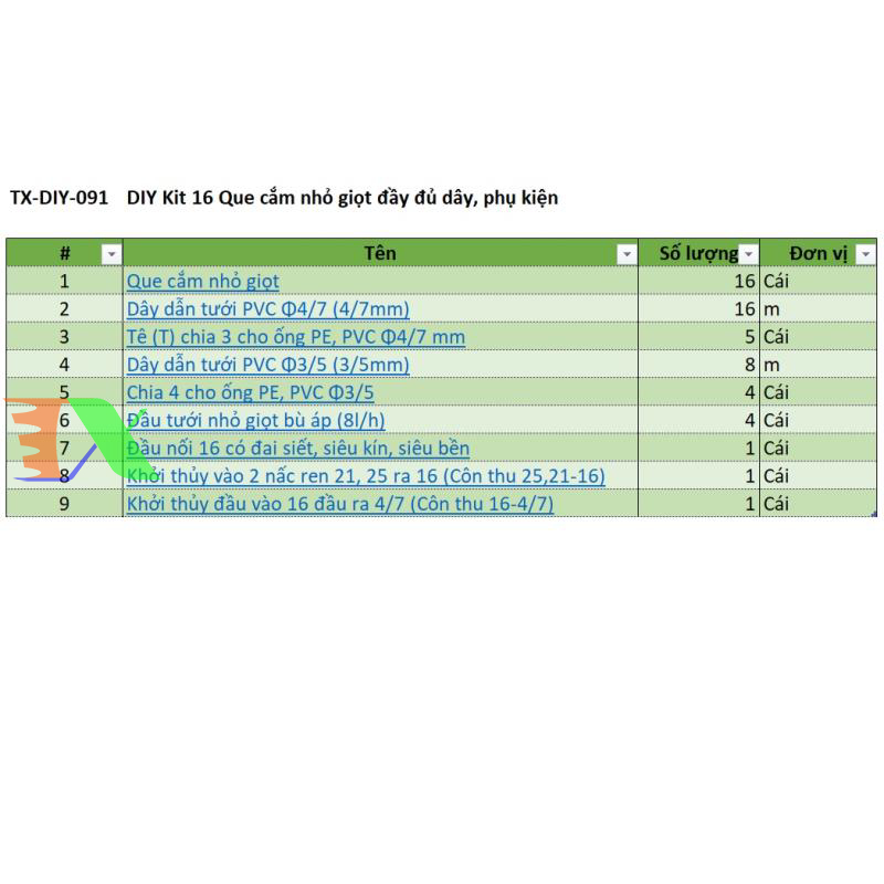 DIY Kit 16 Que cắm tưới xoay đầy đủ dây, phụ kiện (TX-DIY-01). Kit tưới đầy đủ các phụ kiện đi kèm giúp cho các bạn yêu thích trồng rau, hoa dễ dàng lắp đặt. Hệ thống tưới phù hợp với các mô hình vườn gia đình nhỏ, vườn sân thượng, vườn ban công
