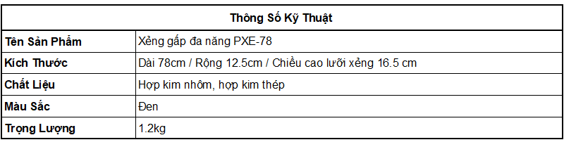 Xẻng gấp đa năng PXE-78 dụng cụ đa năng độc đáo được các nước rất ưa chuộng với nhiều tác dụng trong một cây xẻng nhỏ gọn, xẻng gấp đa năng PXE-78 với thiết kế thép cứng cáp giúp bạn thực hiện được nhiều công việc như đào đất, cắm trại, chặt cây phát quang, cắt thịt, khui đồ hộp, đánh lửa, gỡ lưới câu cá, ... xẻng đa năng là dụng cụ không thể thiếu của mọi người đi rừng, dã ngoại, du lịch, cắm trại, câu cá.