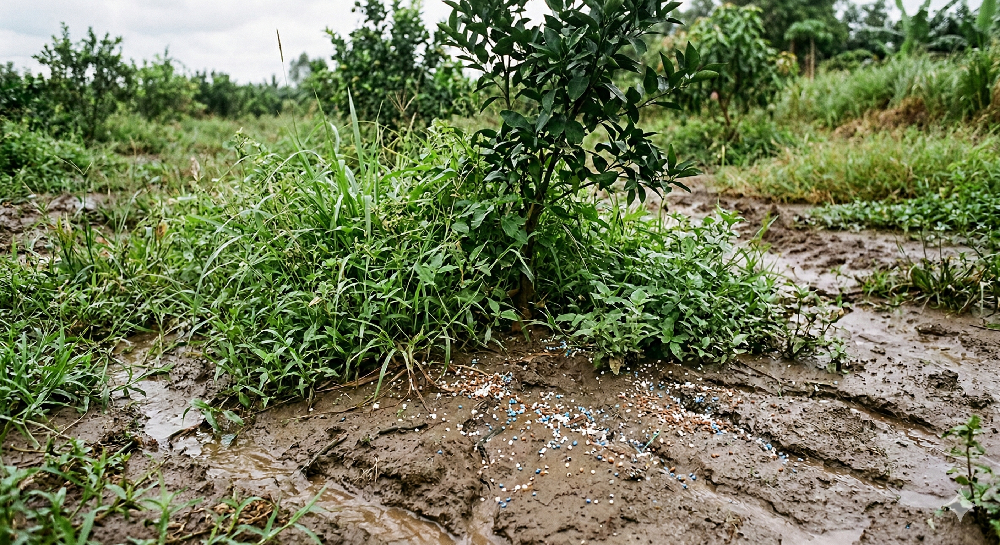 Cỏ dại tranh ăn: Lớp rễ cỏ nằm ngay trên lớp đất mặt sẽ hút trọn lượng dinh dưỡng vàng ngọc này trước khi chúng kịp ngấm xuống tầng rễ sâu của cây chính.