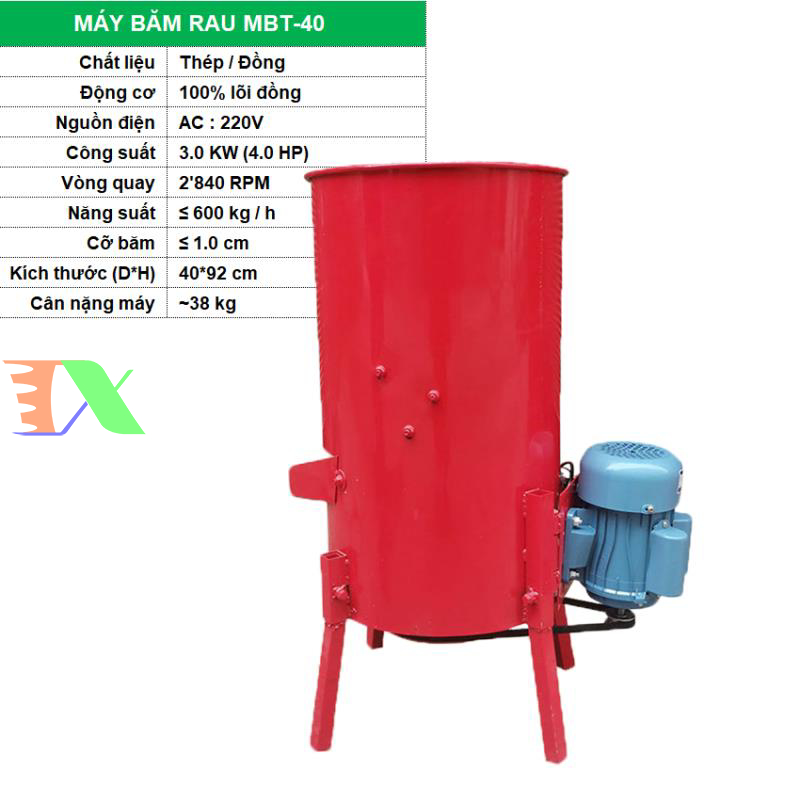 Máy băm rau củ MBT-40 là một sản phẩm giá thành hợp lý trong hệ thống máy nông nghiệp đang được Thapxanh cung cấp trên thị trường. Thiết bị được thiết kế để phù hợp cho các gia đình, các trang trại chăn nuôi nhỏ. Máy có kích thước vừa phải, tiện lợi và đặc biệt là hoạt động bằng động cơ điện 1 pha.